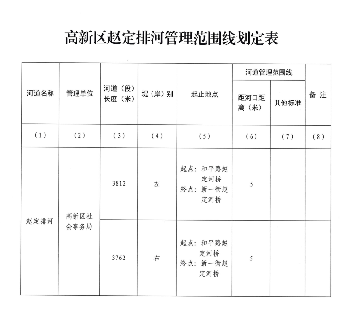 为进一步做好全区河道管理工作,保障行洪及堤防安全,保护河道生态环境,根据《中华人民共和国水法》、《中华人民共和国防洪法》、《中华人民共和国河道管理条例》和《河南省<河道管理条例>实施办法》等法规的相关规定,结合我区实际情况,开展了赵定排河河道管理范围划界工作,划定了河道管理范围,现予以通告。