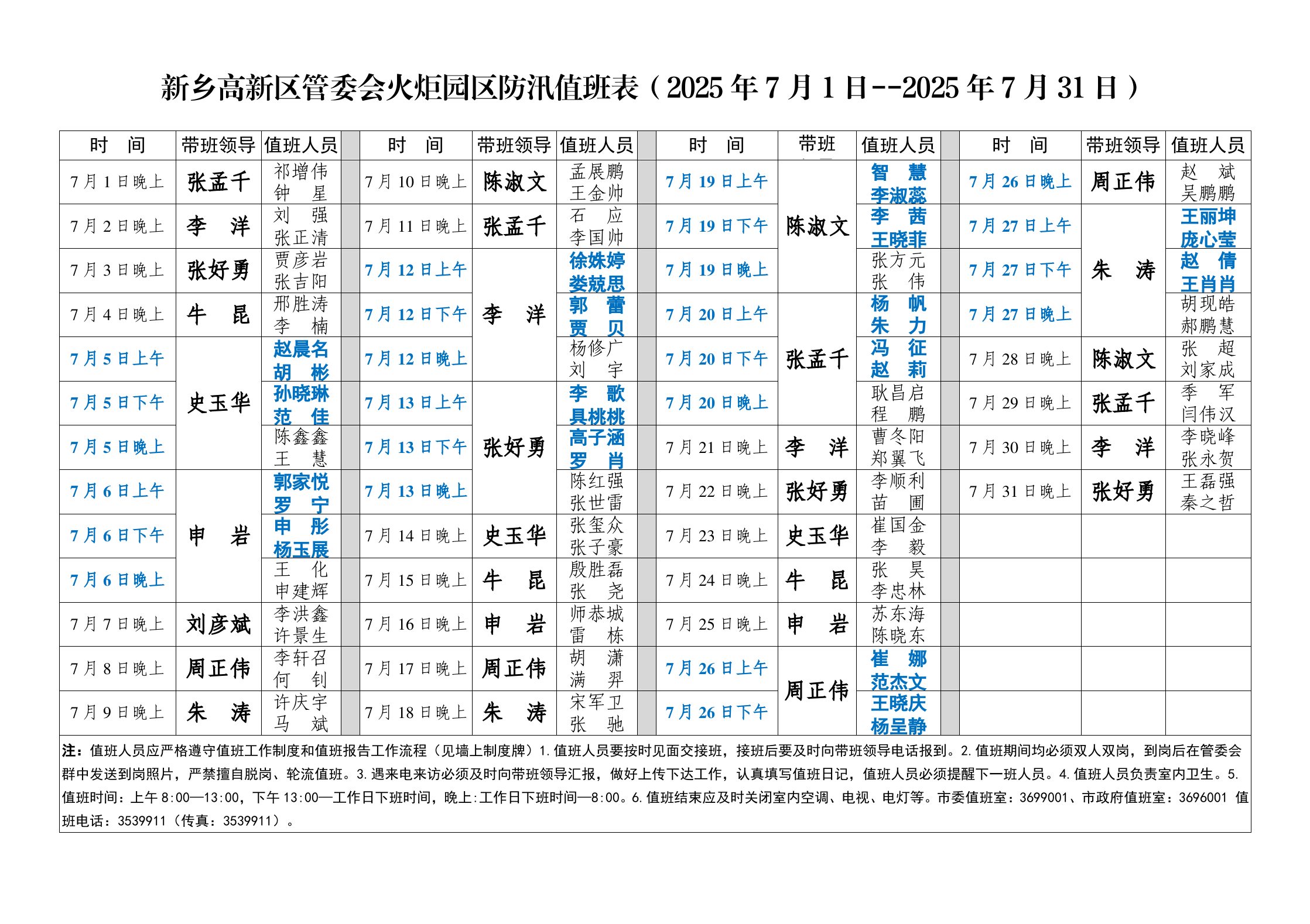 新乡高新区管委会火炬园值班表2025.7.1-2025.7.31