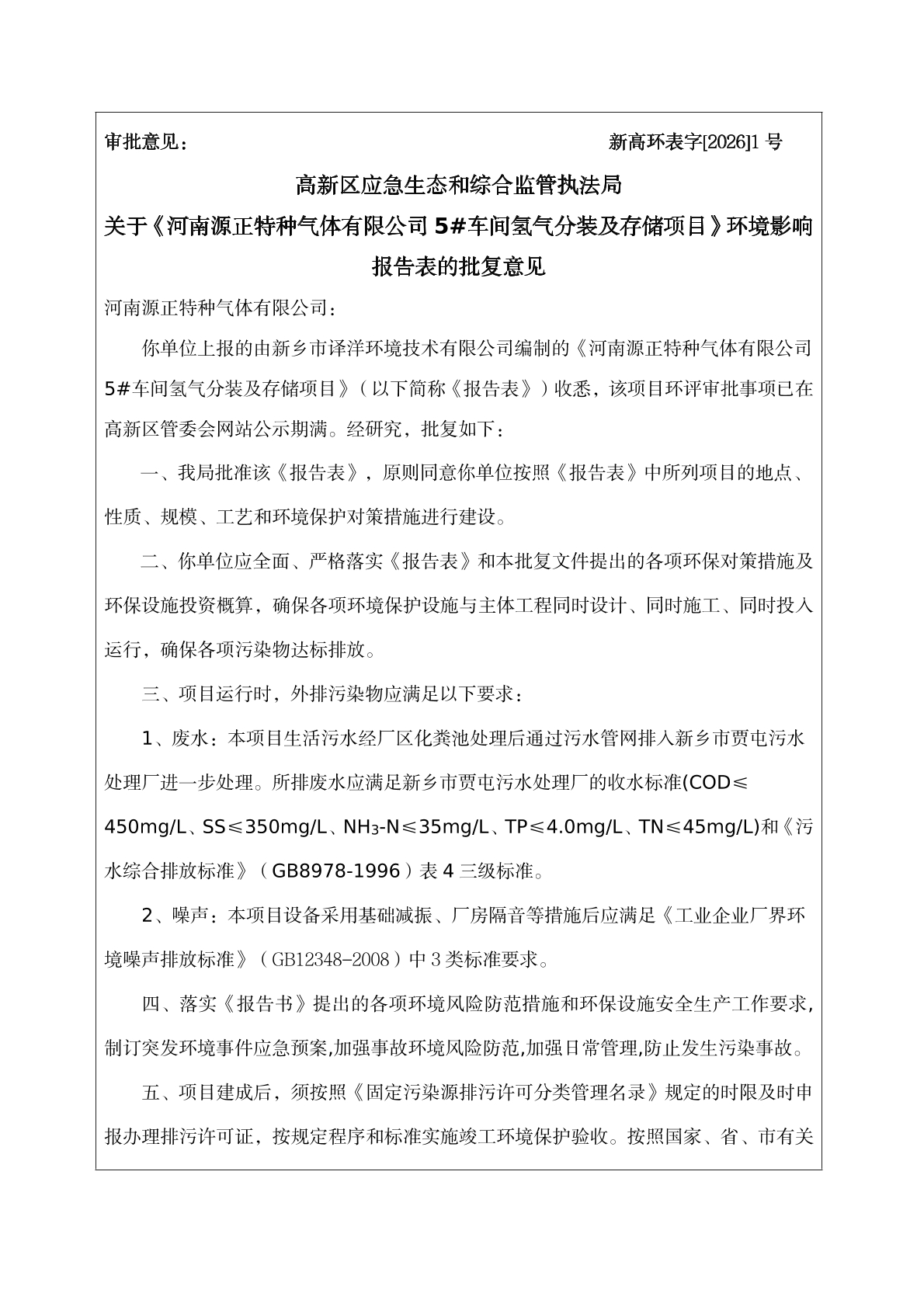 高新区应急生态和综合监管执法局关于《河南源正特种气体有限公司5#车间氢气分装及存储项目》环境影响报告表的批复意见